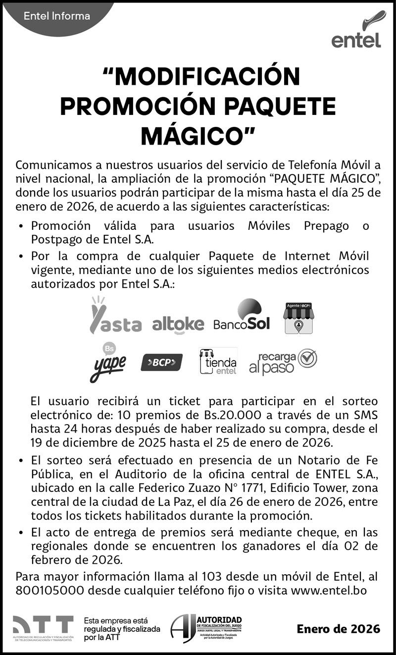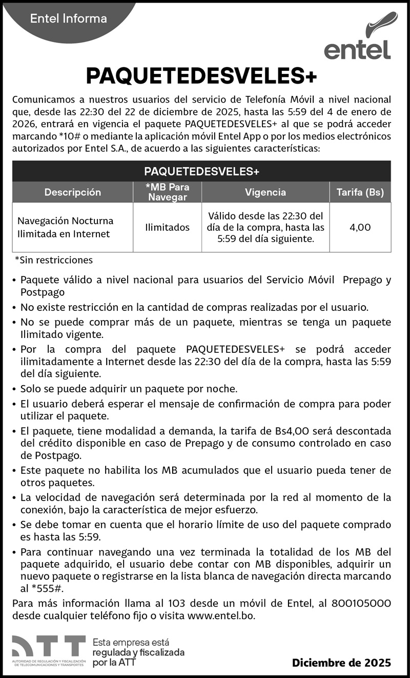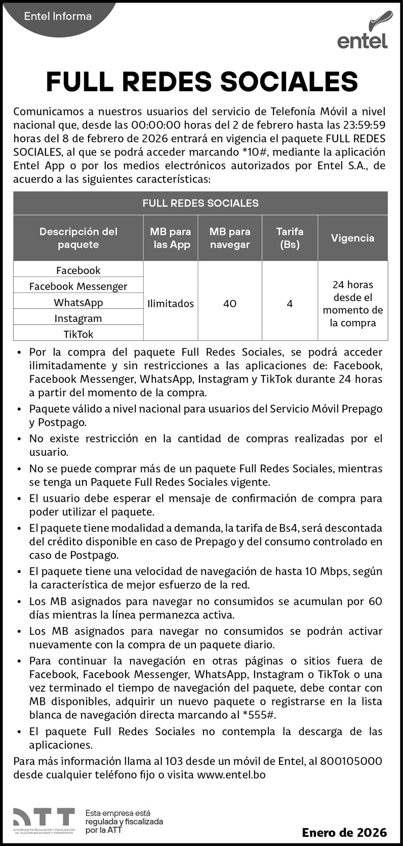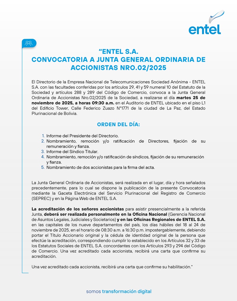 La Empresa Nacional de Telecomunicaciones ENTEL S.A. informa: