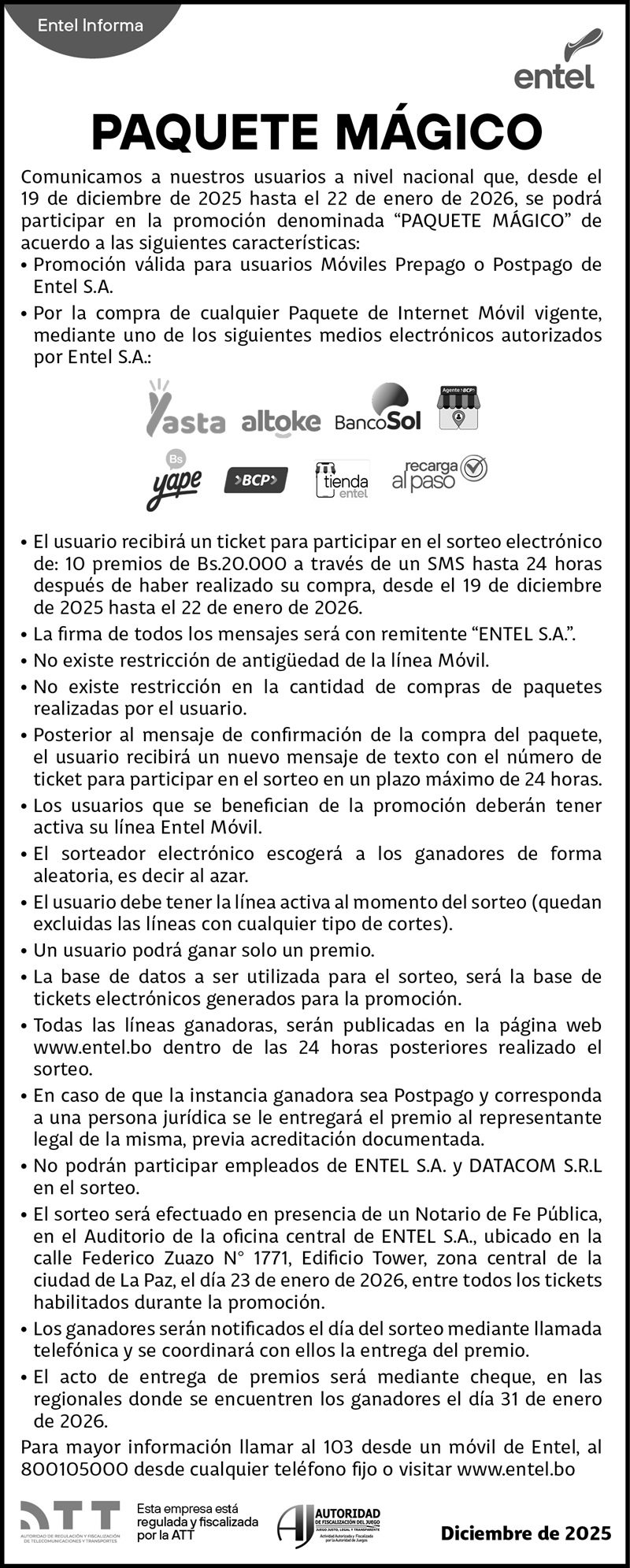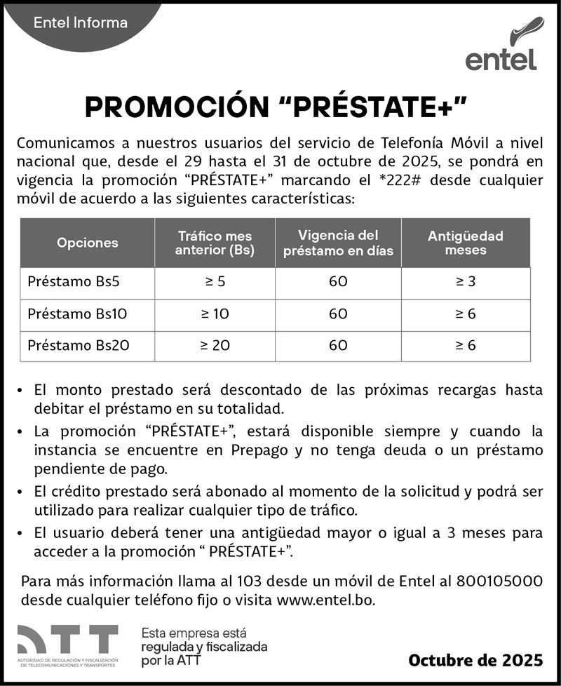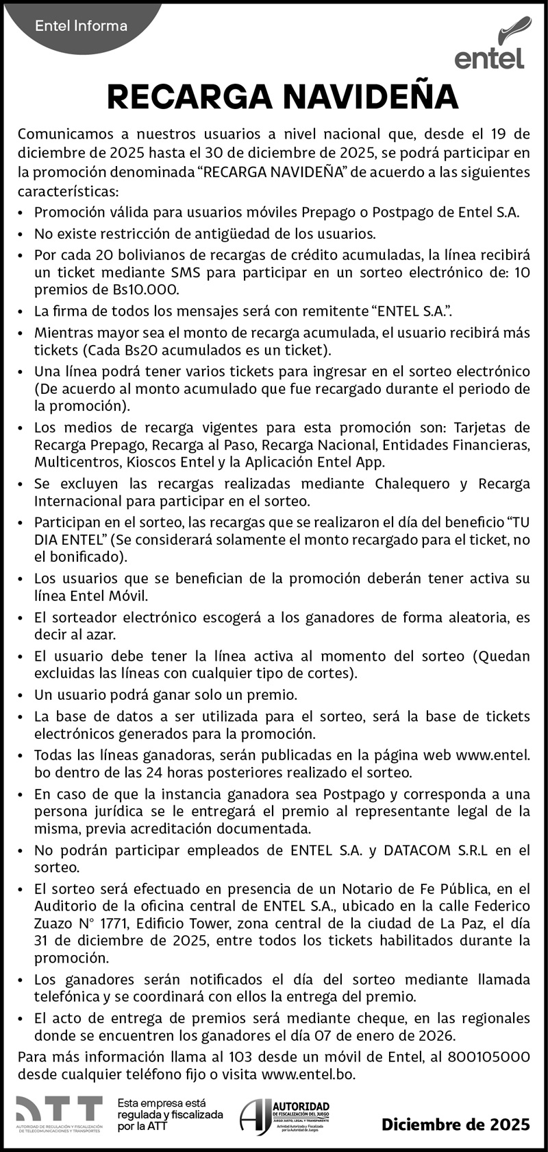 La Empresa Nacional de Telecomunicaciones ENTEL S.A. informa: