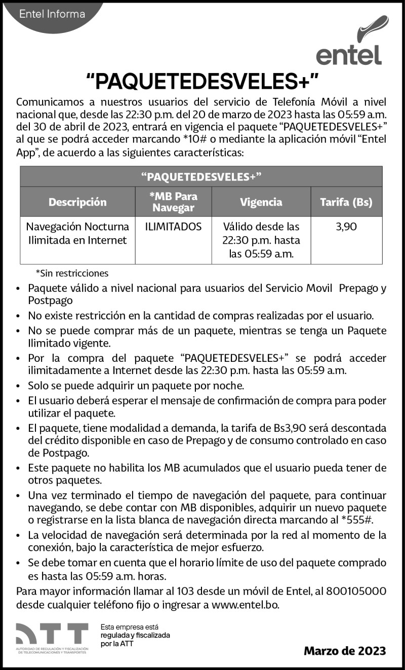 La Empresa Nacional de Telecomunicaciones ENTEL S.A. informa: