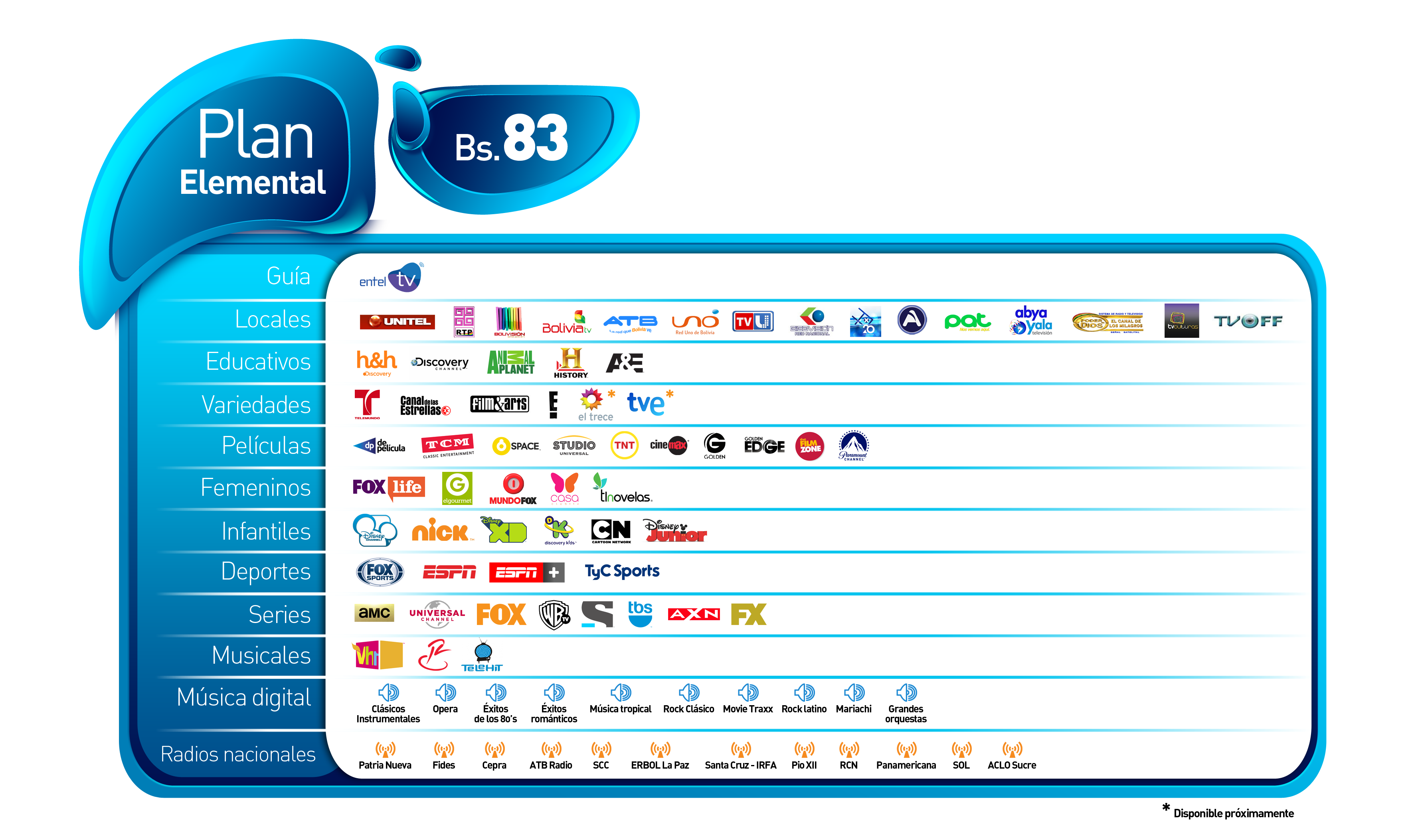 Mayor información 800104488 y grilla de canales en www.entel.bo