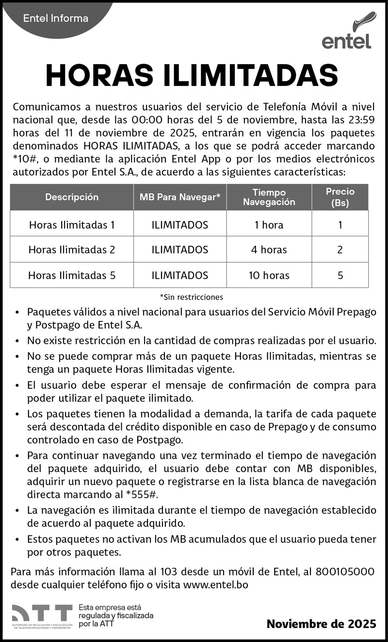 Para que los bolivianos puedan sumergirse en la nueva era de la conectividad, ENTEL S.A. ha lanzado los paquetes “5G ENTEL” —que incluyen opciones como 15.000 MB por Bs 99 (7 días), 22.000 MB por Bs 200 (30 días) y 41.000 MB por Bs 300 (30 días)—, disponibles a través del sitio web oficial (www.entel.bo), pasarelas de pago, las aplicaciones Yape, Yasta, Altoke.